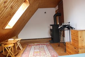 Ferienhaus-Uckermark Schlafzimmer im Obergeschoss rechts mit Kaminofen für Winter Ferien und Urlaub im Boitzenburger Land schon ab 29,- Euro pro Tag
