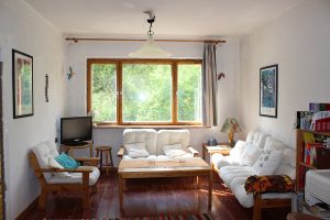 Das Ferienhaus-Uckermark Wohnzimmer mit Klavier und gemütlichem Kachelofen durch die Winterferien. Selbstversorger Urlaub im Boitzenburger Land schon ab 29,- Euro pro Tag
